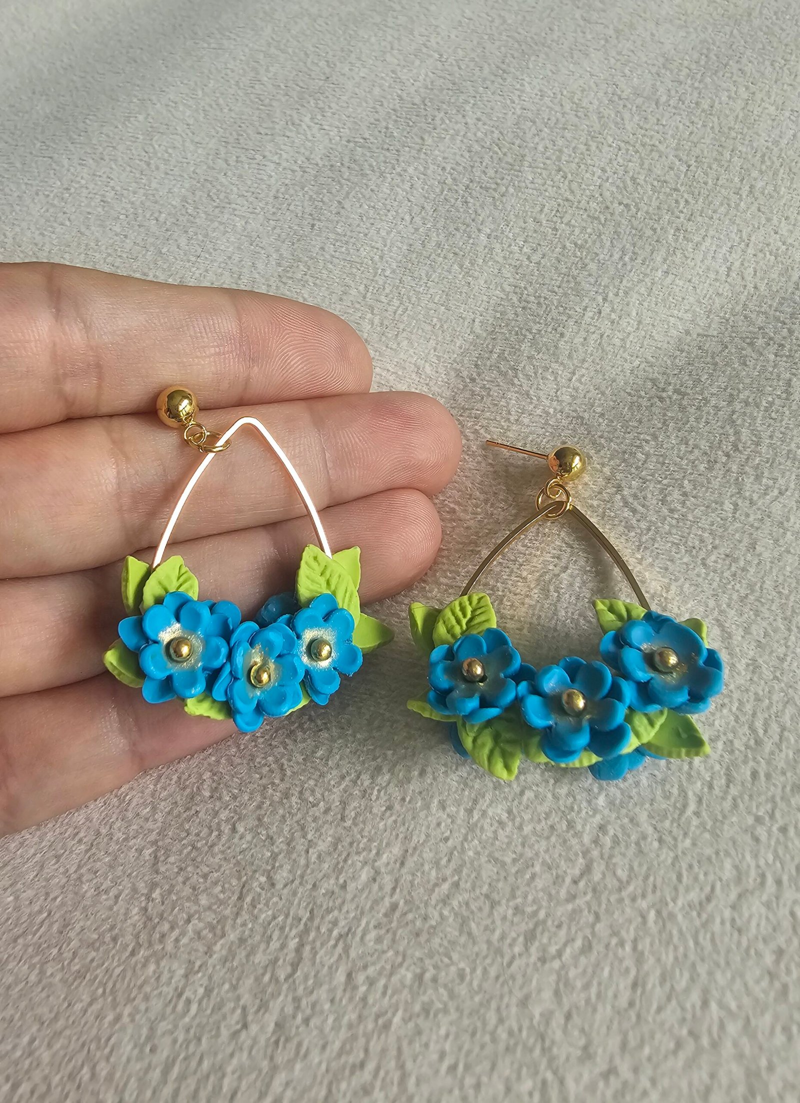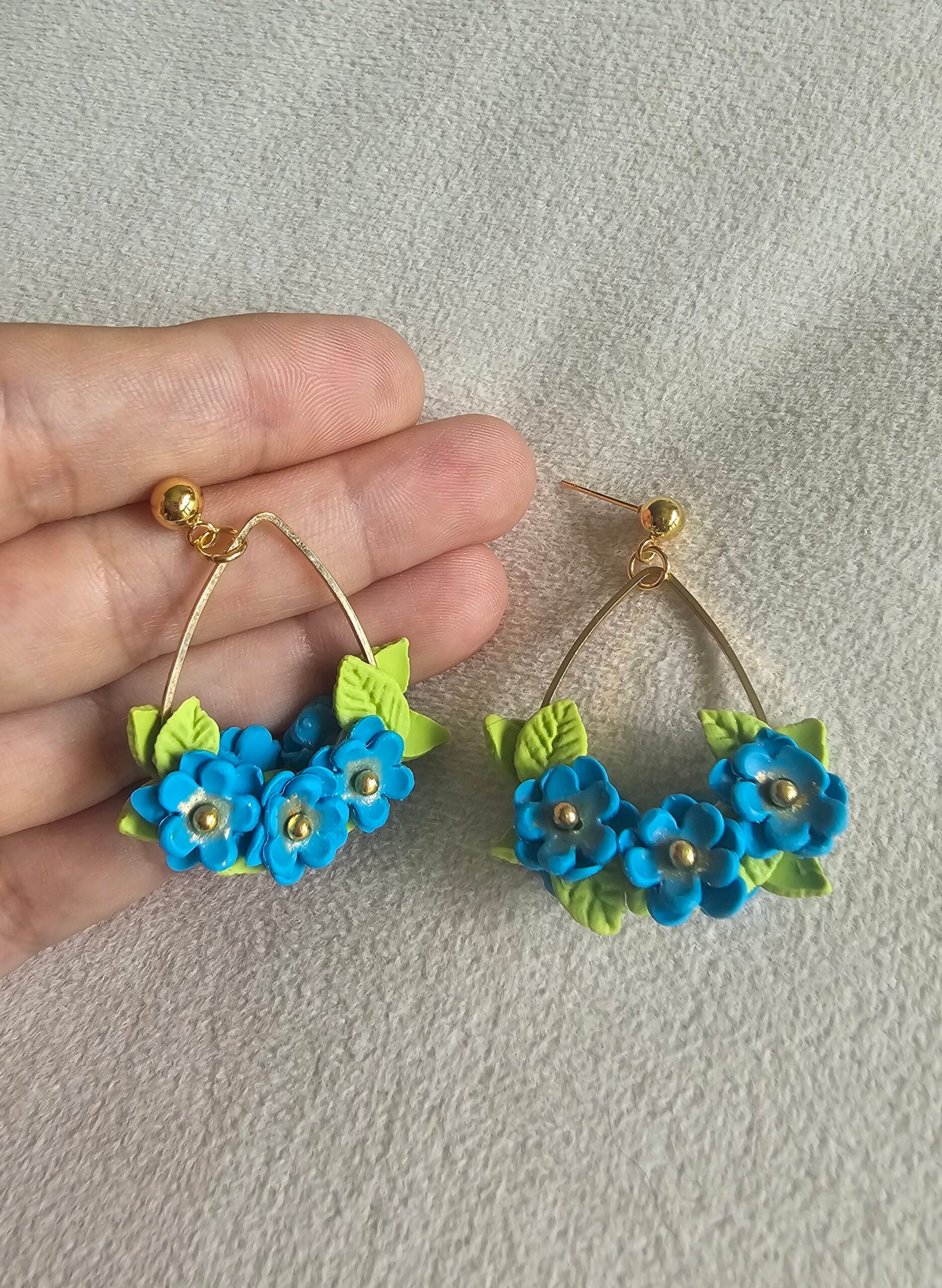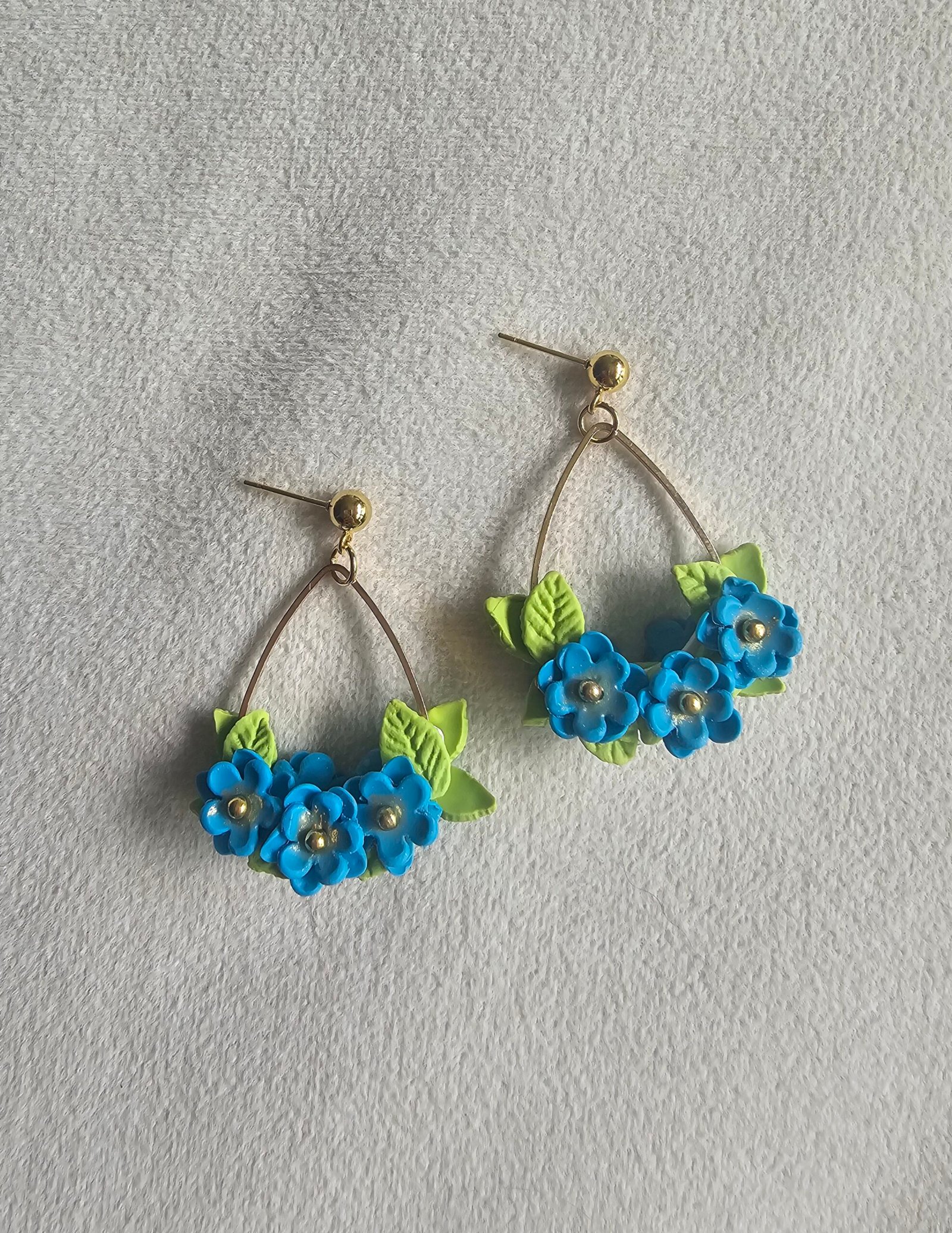 A delicate arc of vivid blue blooms paired with fresh green leaves, softly suspended from a gold frame. This design captures the feeling of a quiet garden moment — cheerful, balanced, and effortlessly wearable.