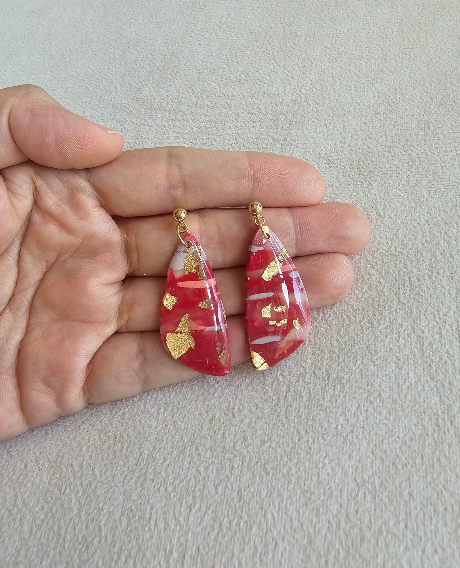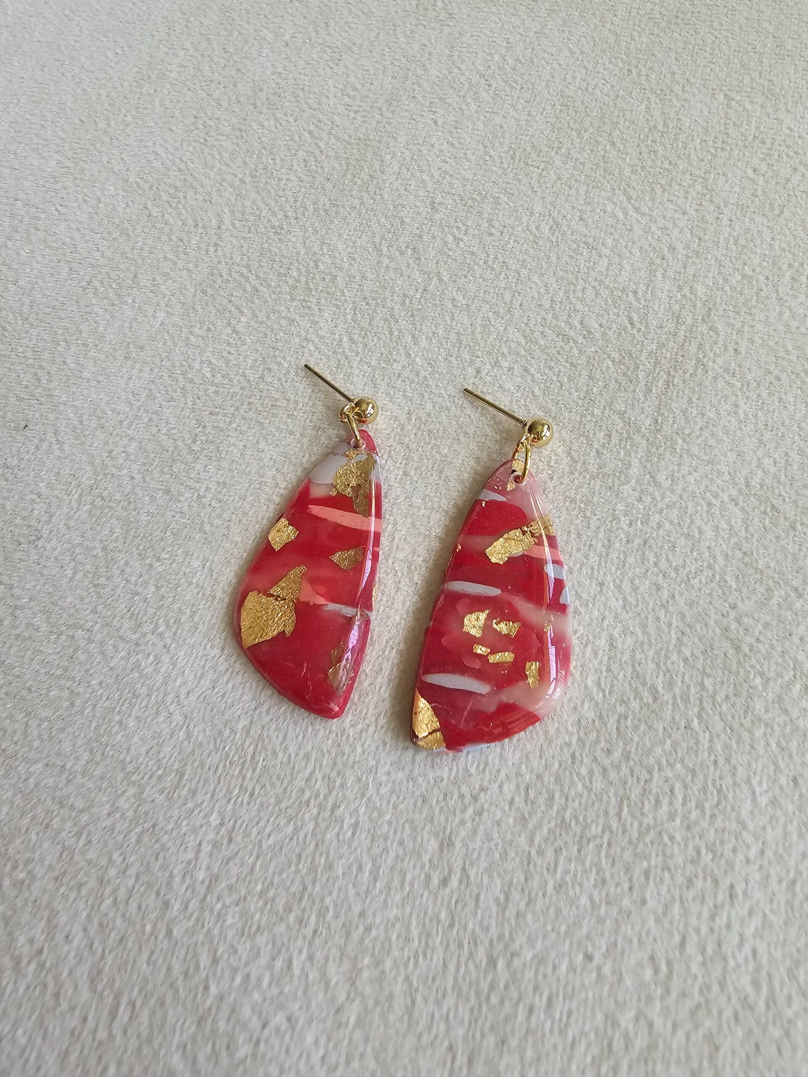 A striking pair of handcrafted drop earrings featuring rich crimson tones layered with soft marbling and delicate gold foil accents. Each piece is uniquely shaped, catching the light beautifully while remaining elegant and wearable.