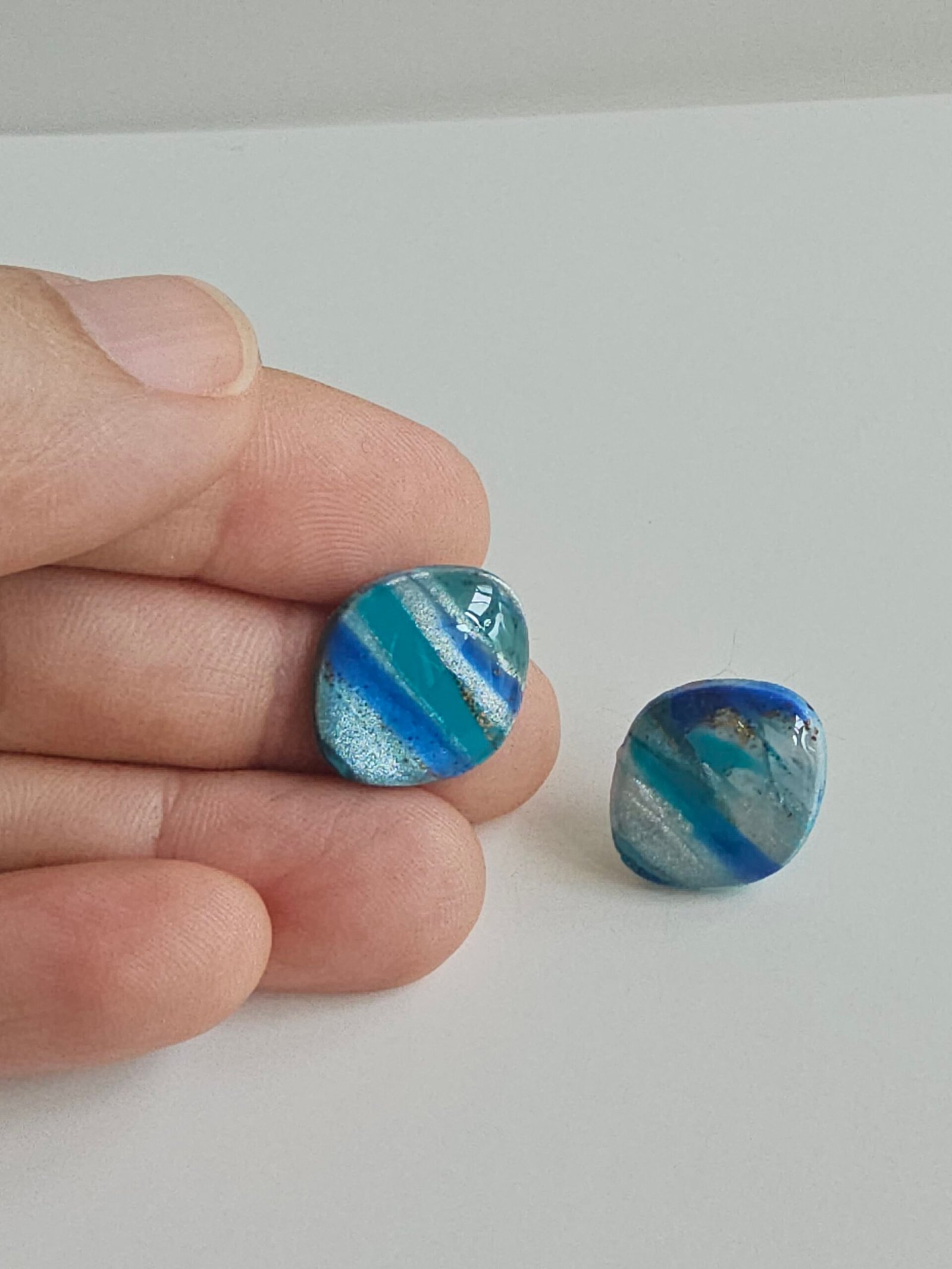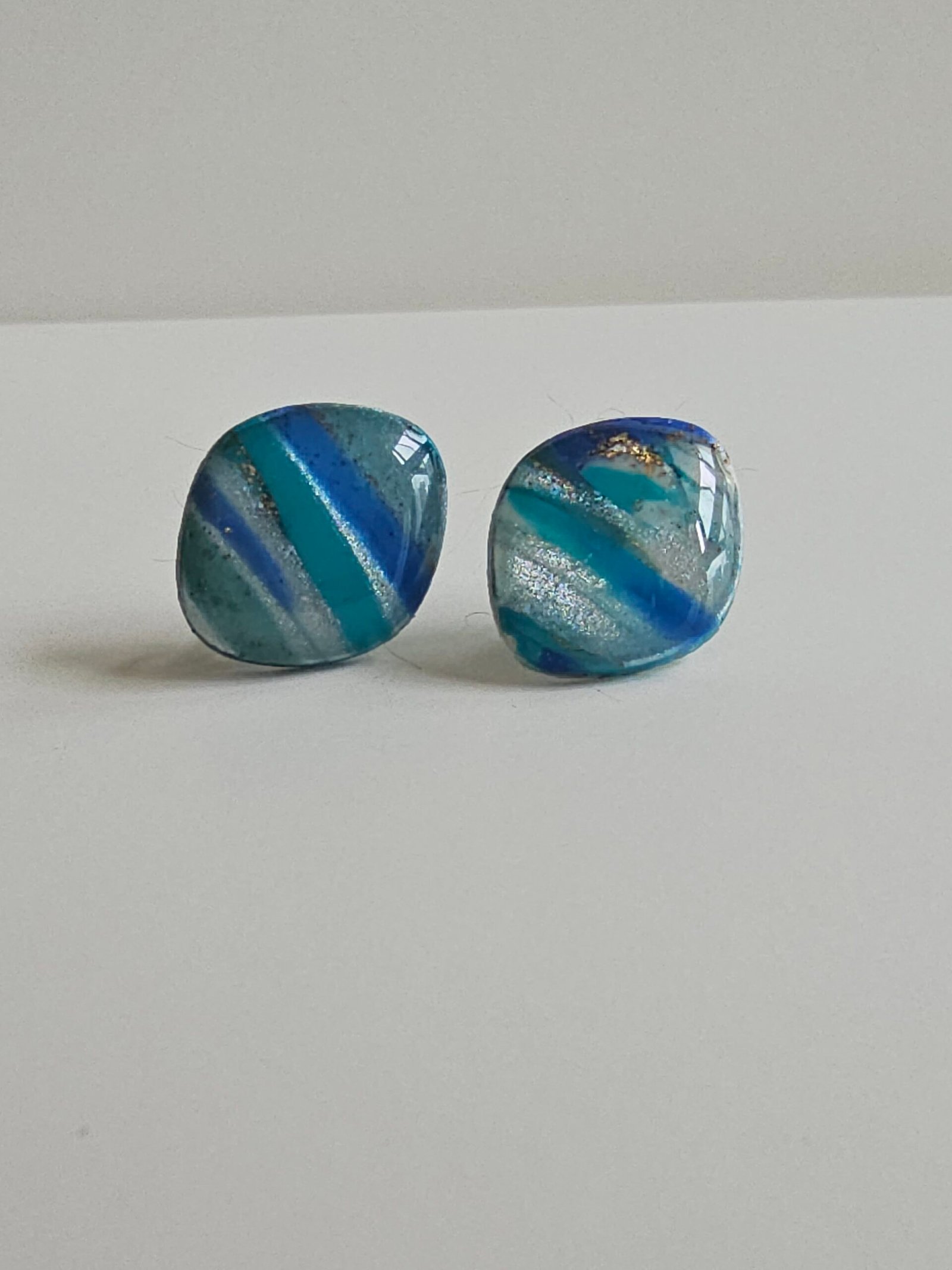 Petite square studs marbled with layered blues, soft greys, and subtle shimmer — understated, modern, and perfect for everyday wear.