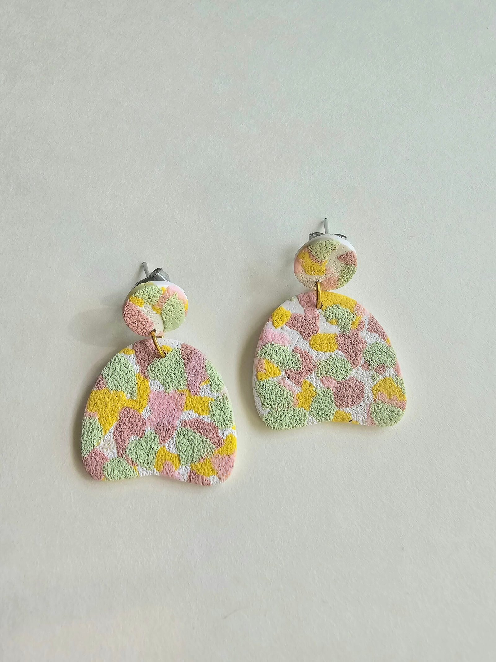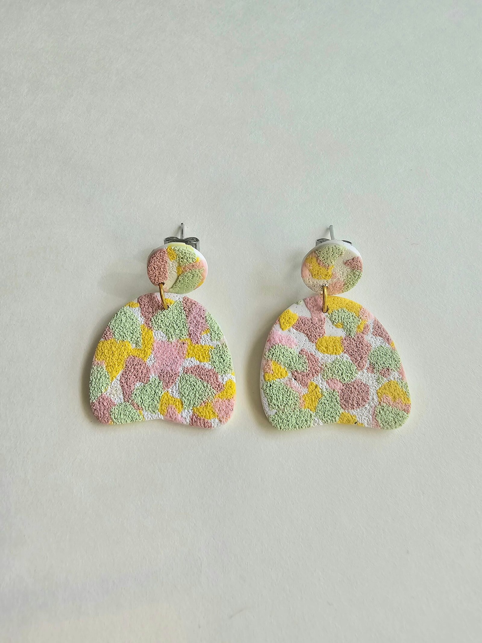 A soft, playful pair featuring an organic petal silhouette adorned with a pastel mosaic of blush pink, butter yellow, mint green, and soft white. Textured and light-hearted, these earrings bring a gentle pop of colour while staying effortlessly wearable.