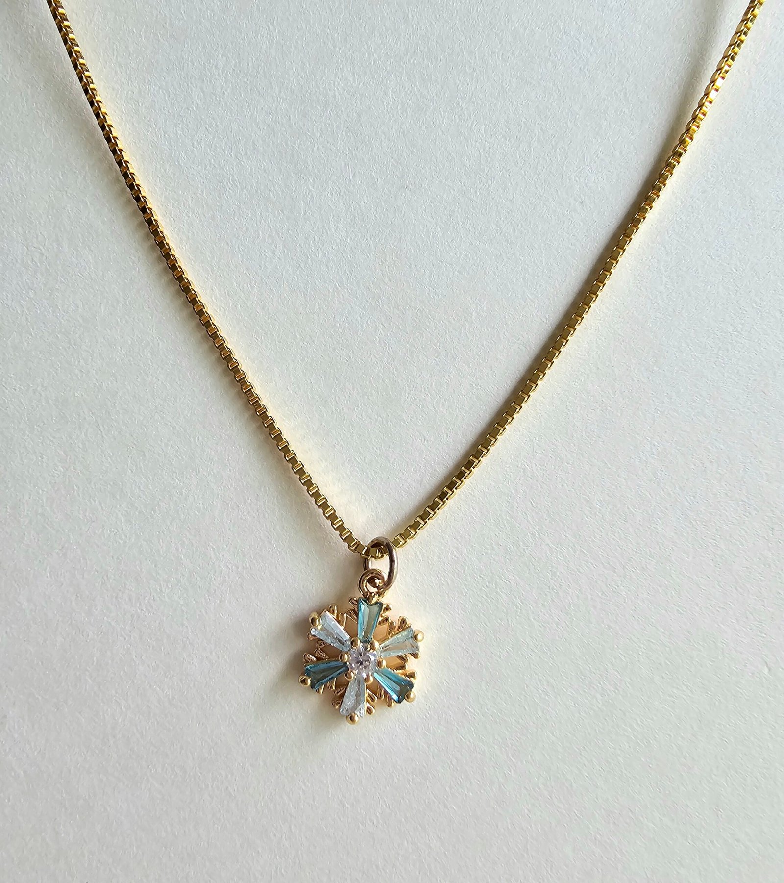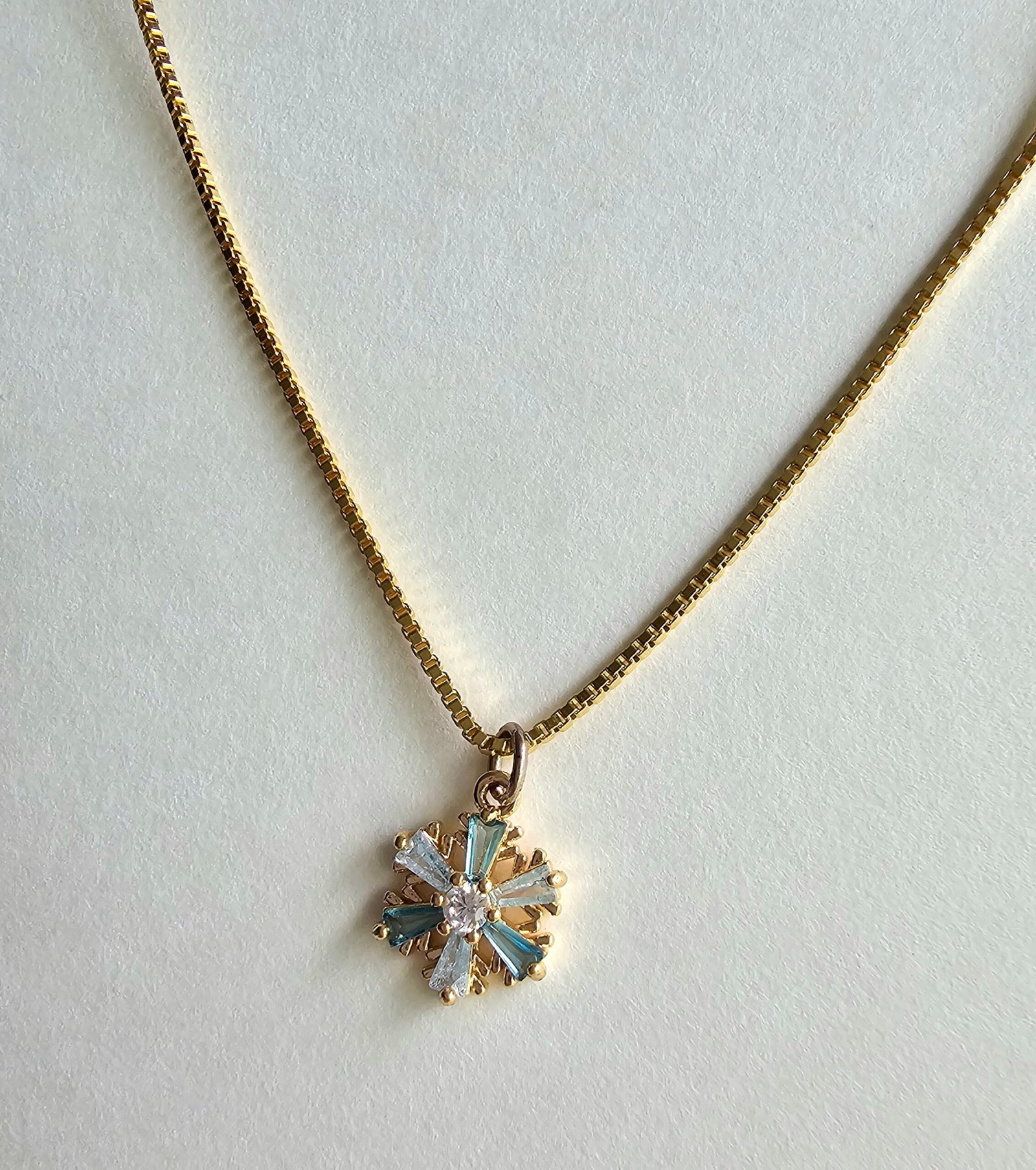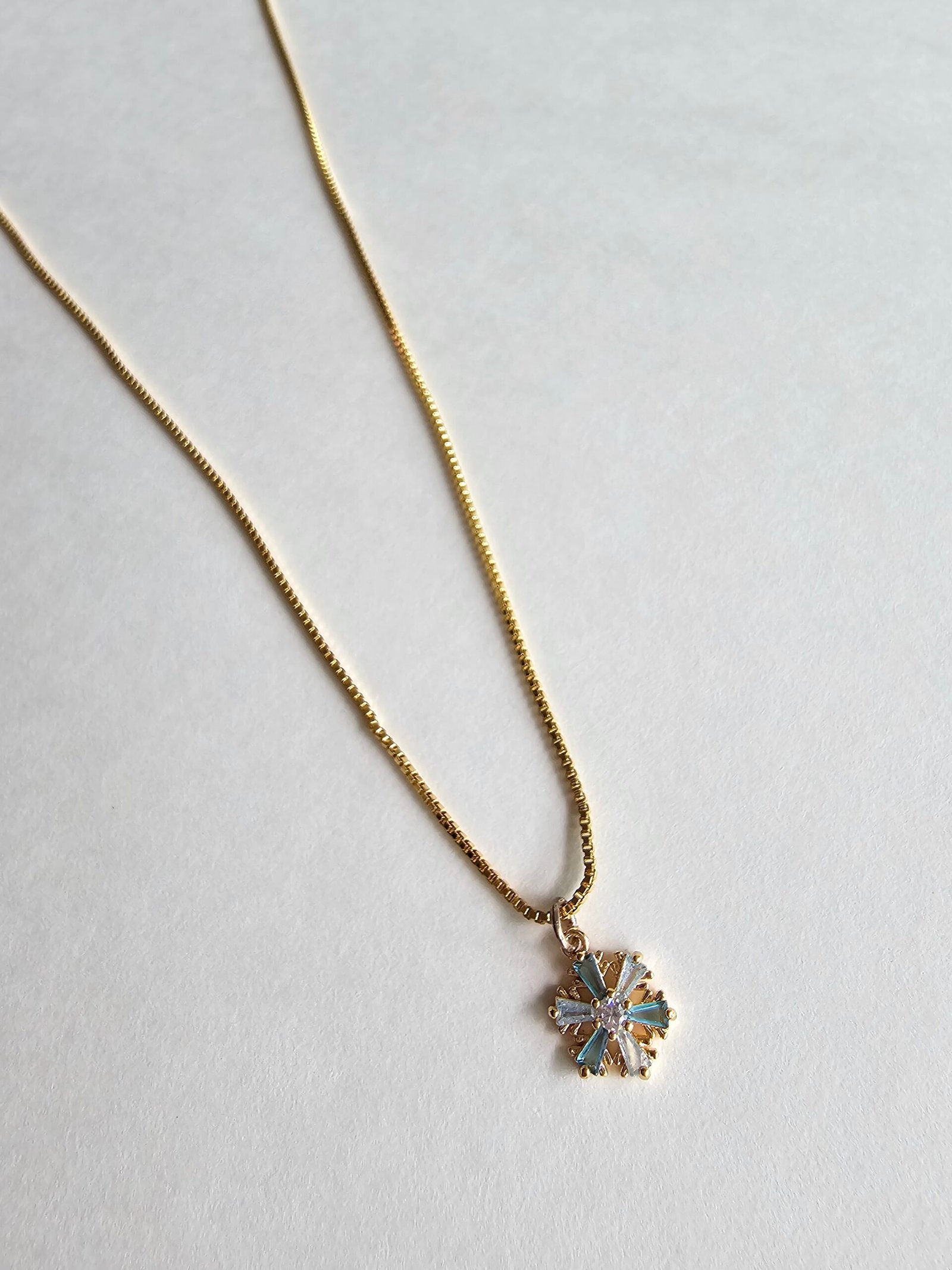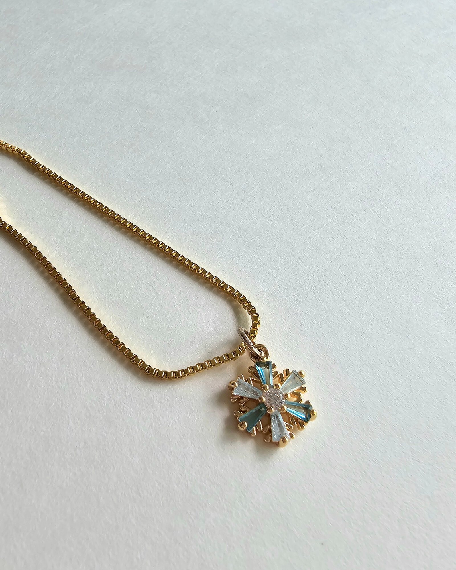 A soft shimmer inspired by falling snow, this delicate snowflake pendant catches the light with quiet elegance. Accented with cool blue and clear crystals, it brings a gentle sparkle that feels light, graceful, and timeless.